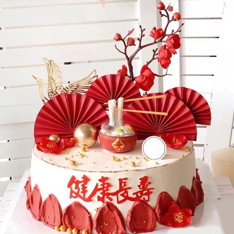 淘新中式长辈祝寿蛋糕装饰爷爷奶奶摆件国风扇子生日甜品台装扮插件