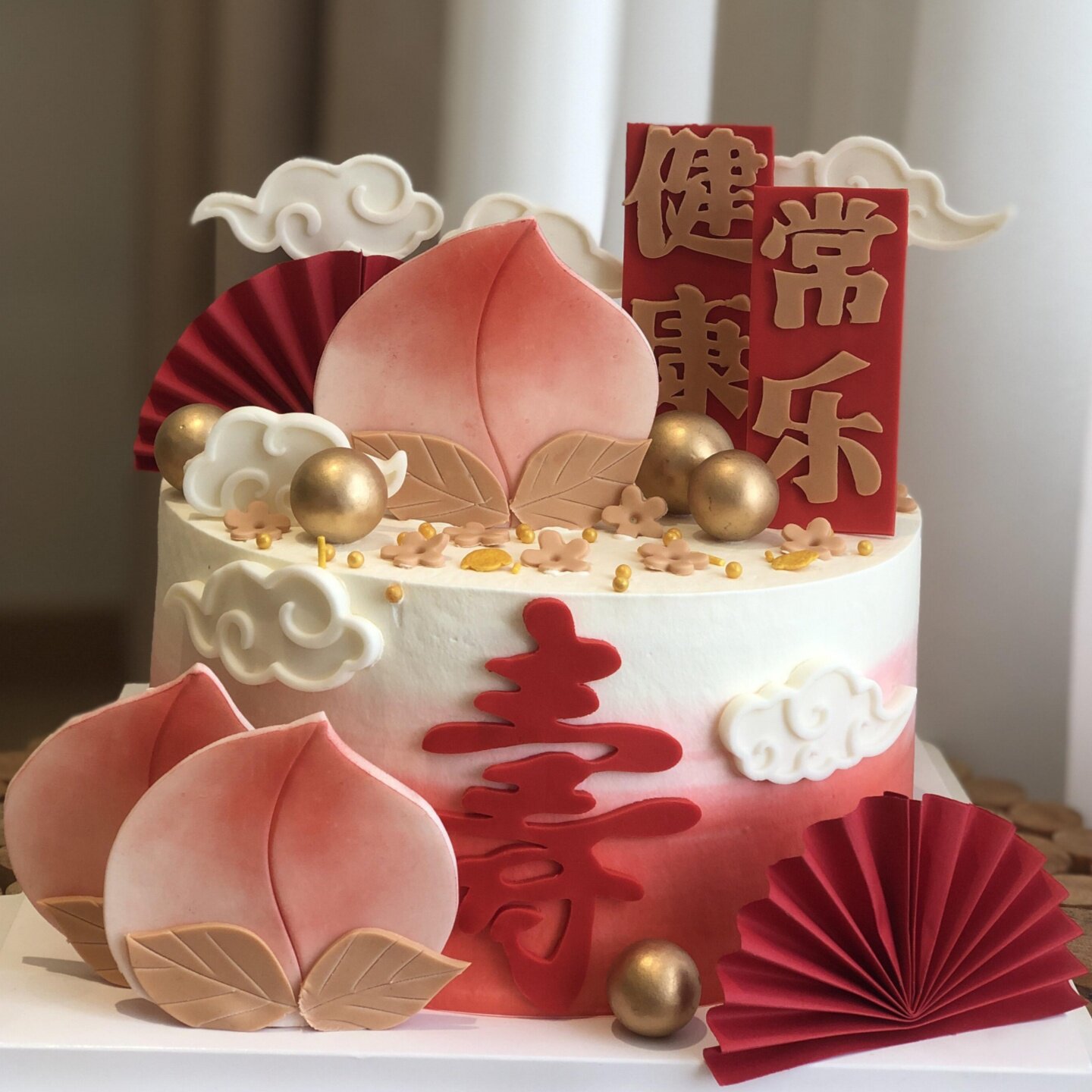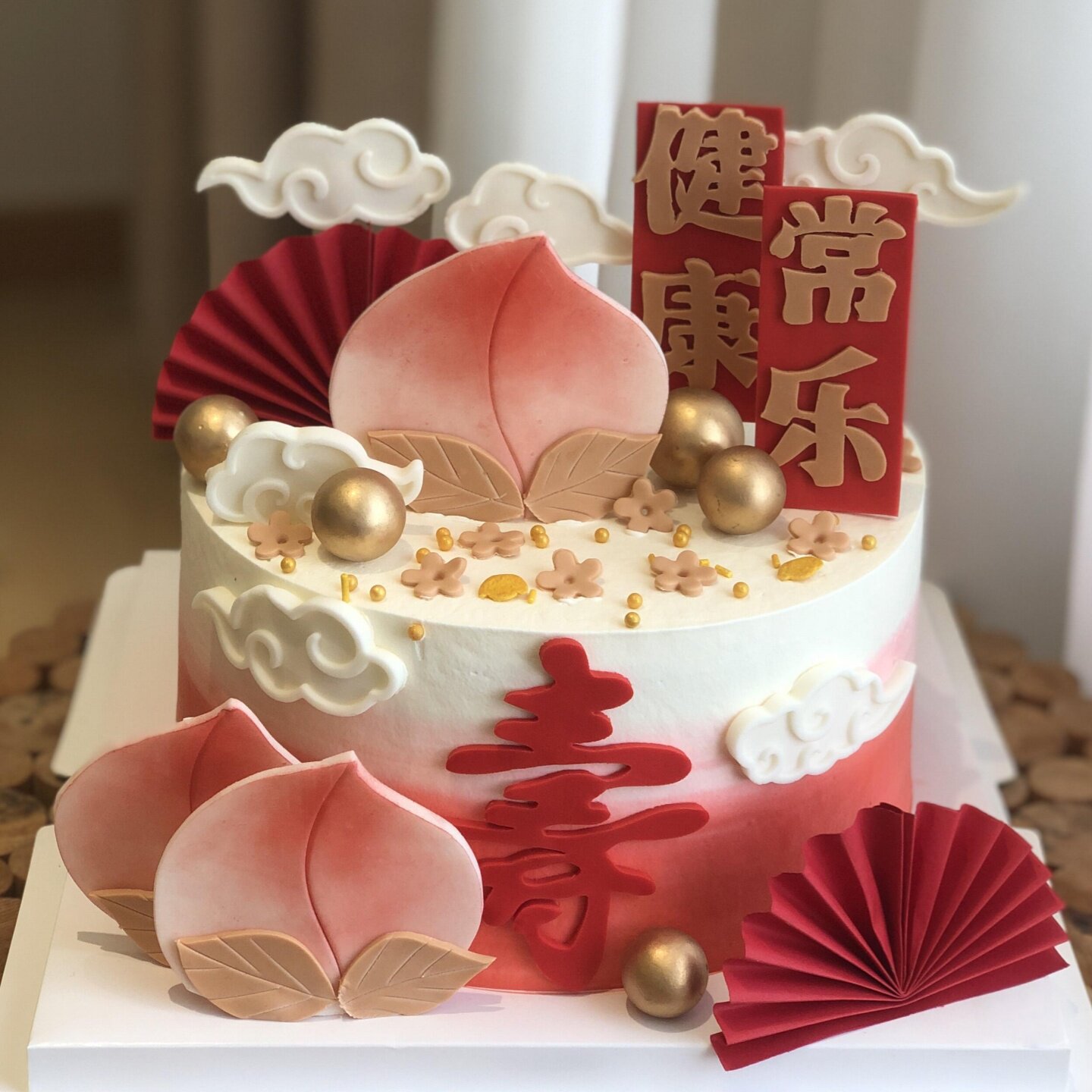 淘宝健康常乐祝寿蛋糕装饰寿桃祥云红色扇子爷爷奶奶生日烘焙装扮插件