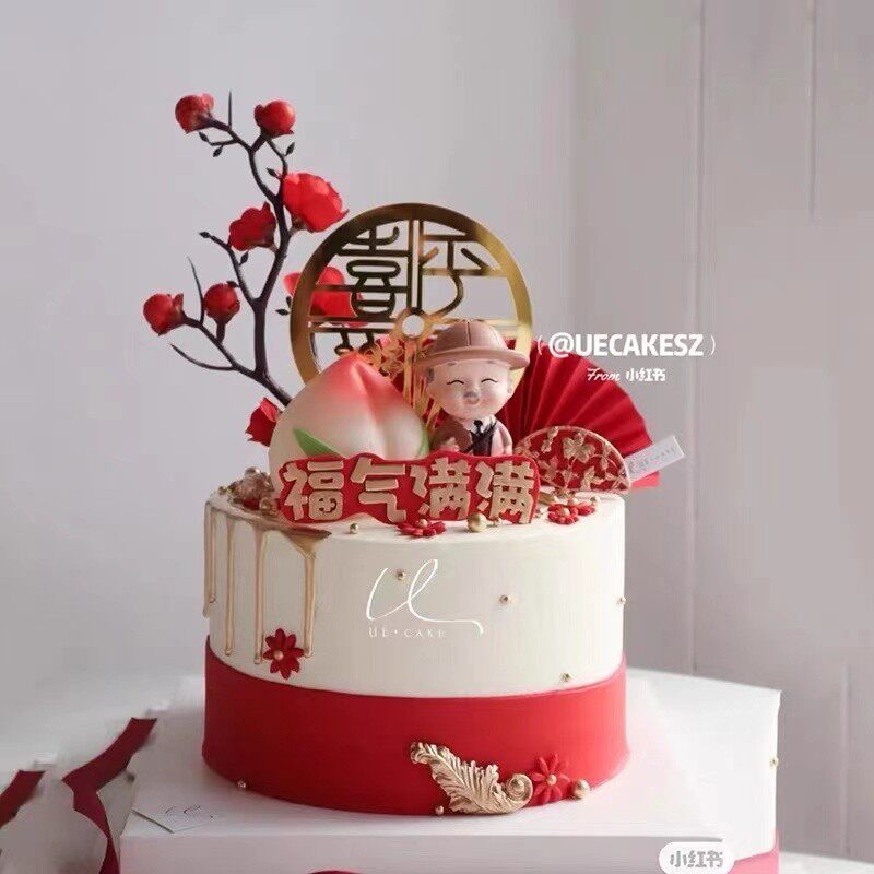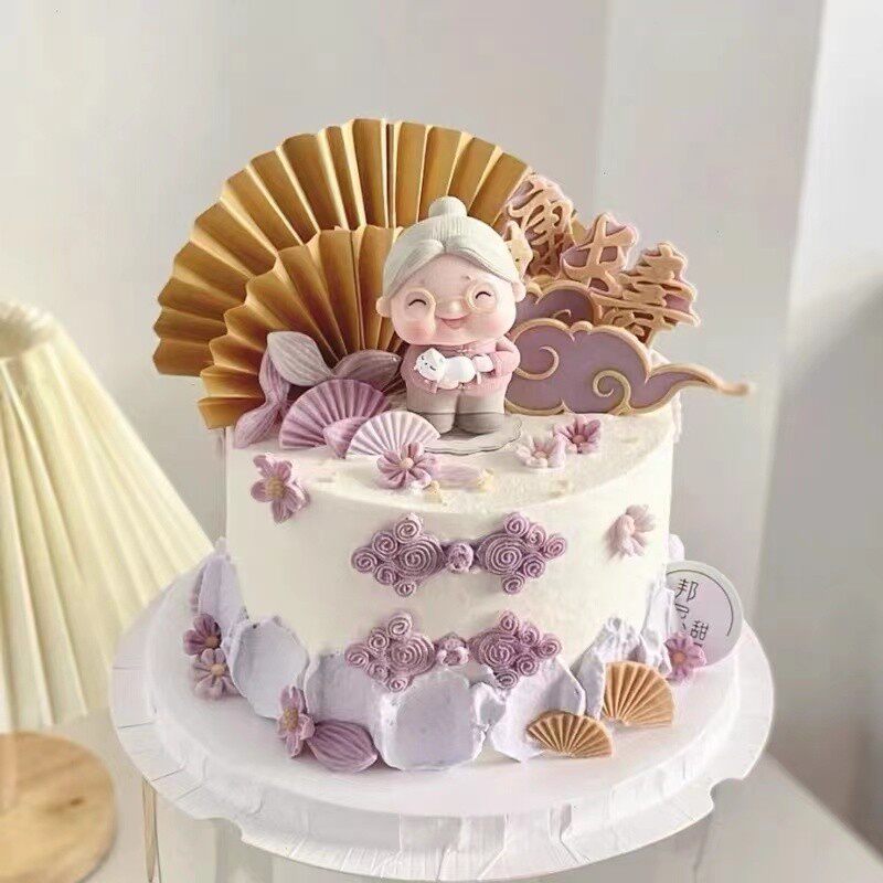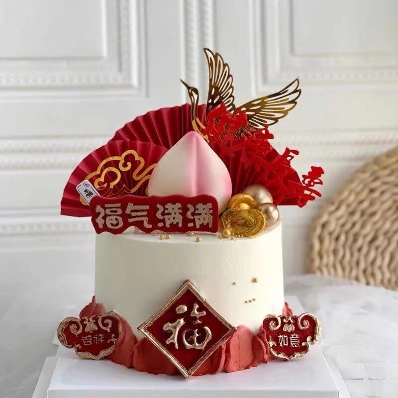 淘新中式长辈祝寿蛋糕装饰爷爷奶奶摆件国风扇子生日甜品台装扮插件